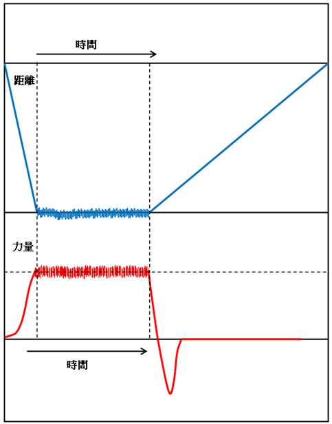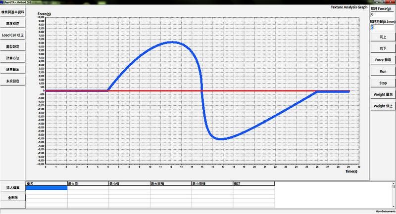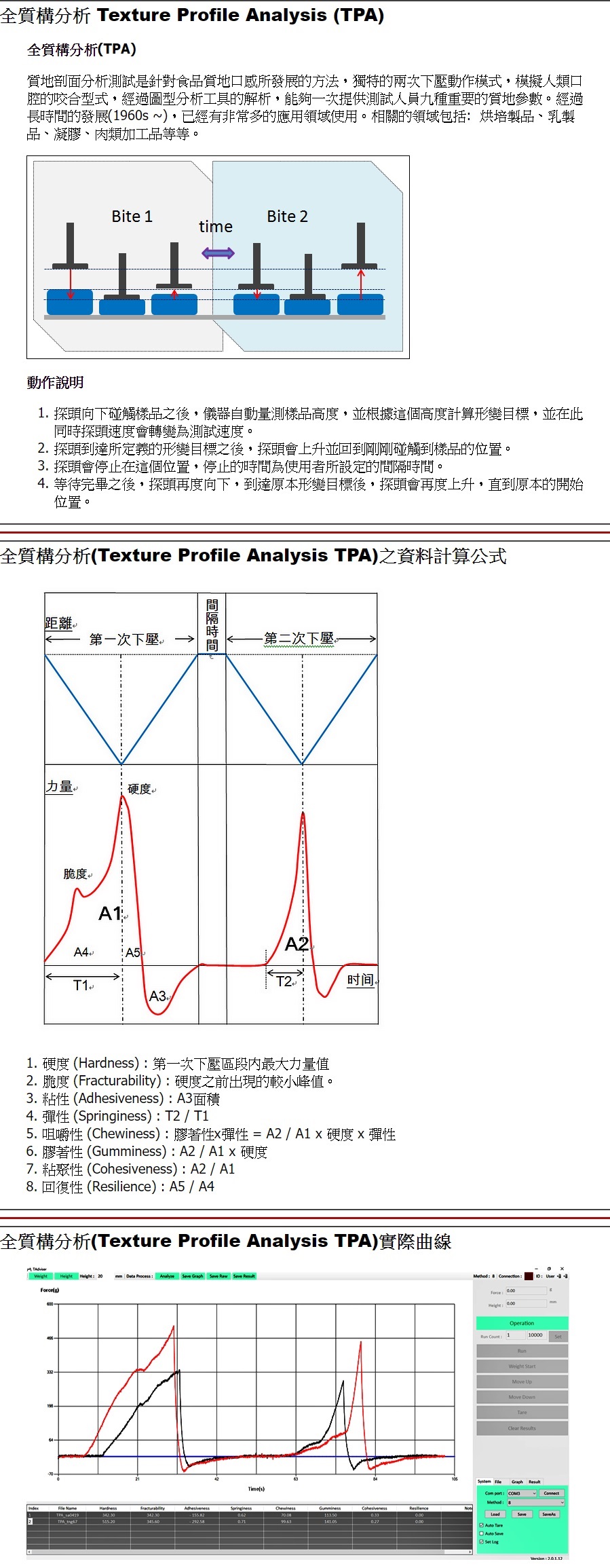 質構儀測ˋ測試項目:1.定形變(strain%)下壓測 應用在:麵包、烘焙業,計算麵包硬度(Hardness)與彈性(Resilience)等兩個參數值。 2.定力(force)下壓測試 應用在:膜、特殊材料張力測試 3.定距(distance)-上拉測試 應用在:任何材料基礎測試 4.定距(distance)-下壓測試 應用在:任何材料基礎測試 5.全質構(Texture Profile Analysis-TPA)定形變/定距下壓測試 應用在烘焙製品、乳製品、凝膠、肉類等食品加工業 6.粘性(adhesion)/蠕變(creep)測試 應用在黏性膠帶、貼布、藥妝產品。 6-1.鬆弛測試(Relaxation test):下壓或上拉到達指定位置,停止一段時間,再回到原起點。當物體受力之後產生本身外型改變,當此同時會產生應力。但這樣的應力會隨時間遞減,這樣的特性可以反應材料的彈性。主要用在檢測食品的彈性相關參數。7.依照產品需求客製測試路徑專用質構儀軟體功能 保留其最核心的操作架構。能夠即時將儀器所得到的數據進行繪圖、計算、並可以將其輸出到其他軟體作為後續應用之用。重要的核心功能如下 : 高度校正 "高度校正" 最主要的功能是測定探頭前端與底座的距離,經由高度校正的功能,使得儀器可以拆解攜帶,以及能夠搭配不同種的配件進行樣品分析。 力校正 力量傳感器(loadcell),斜率會隨著環境、使用時間而有少許的改變。每次使用前,進行力校正,保證力量傳感器的可追朔性。使用者使用第三方驗證標準砝碼進行校正。修正斜率。每次歸零時僅調整截距。確保數據準確。 曲線、原始數據、計算結果匯出 原始數據經過軟體進行繪製,自動計算結果。曲線(Curve)、原始數據(Raw Data)、結果(Result),可以匯出為圖形檔、Excel。 計算方法 當實驗完成後,得到由原始數據繪圖。繪圖完畢由軟體自動計算數據。能夠計算正最大值、正面積、負最大值、負面積等等,並可以依照使用者需要,增加新的計算項目。 RapidTA專用質構儀軟體Y軸座標為力(gf),X軸座標為時間(sec),探頭上下移動可以由右側按鍵控制。
