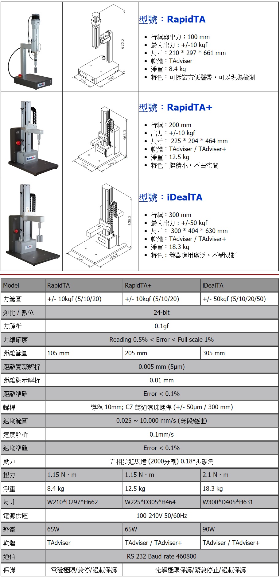 台灣製造,售後服務快速,不怕質構儀變孤兒推薦電腦軟體WIN10 最穩定,WIN 7 之前不支援基本款-方便攜帶-專用質構儀 (Rapid TA)介紹 行程與出力:100 mm 最大出力 : +/-10 kgf 尺寸:210 * 297 * 661 mm 軟體:TAdviser 淨重:8.4 kg 特色:可拆裝方便攜帶,可以現場檢測 儀器特色 : 電動缸、主機可以分開組裝在其他儀器或設備上。 儀器淨重8.3kg方便攜帶,能夠在田間、野外、工廠等其他臨時地點使用。 使用五相步進馬達(0.72°/步)、高精度電動缸,提供精確的數據結果。 自動重量校正與自動尋找零點位置,自動量測樣品高度並設定目標形變百分比。 能進行連續多次重複測試,可以應用在疲勞測試領域。 原始數據、圖、計算結果能夠個別導出。 儀器機構、軟體、韌體可以接受客製。 質構儀測試項目:1.定形變(strain%)下壓測 應用在:麵包、烘焙業,計算麵包硬度(Hardness)與彈性(Resilience)等兩個參數值。 2.定力(force)下壓測試 應用在:膜、特殊材料張力測試 3.定距(distance)-上拉測試 應用在:任何材料基礎測試 4.定距(distance)-下壓測試 應用在:任何材料基礎測試 5.全質構(Texture Profile Analysis-TPA)定形變/定距下壓測試 應用在烘焙製品、乳製品、凝膠、肉類等食品加工業 6.粘性(adhesion)/蠕變(creep)測試 / 鬆弛測試(Relaxation test) 應用在黏性膠帶、貼布、藥妝產品。 6-1.鬆弛測試(Relaxation test) 主要用在檢測食品的彈性相關參數。 7.依照產品需求客製測試路徑RapidTA系統包含了什麼? 主機 : 依照實際測定需要決定測試行程與力範圍。 軟體 : 專用軟體,能夠針對需求做控制與計算。 探頭依照需求另行製造報價