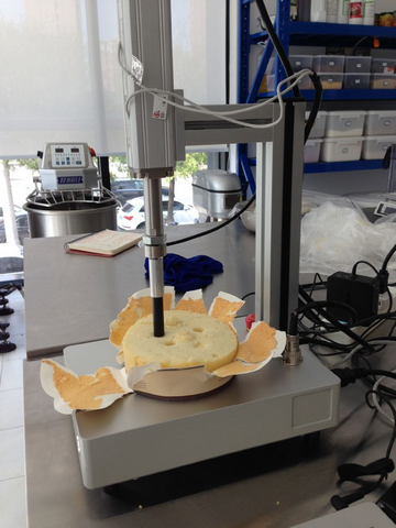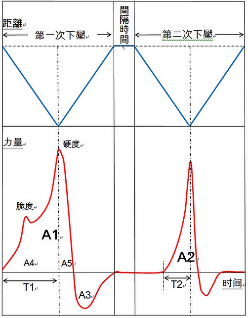 全質構分析(TPA)名詞定義 硬度 (Hardness) : 最直接反應口感的一項指標,在質地剖面分析中,直接影響咀嚼性 (Chewiness)、膠著性(Chewiness)及凝聚性(Cohesiveness)。 脆度 (Fracturability) : 針對樣品有酥脆外殼(外皮)者樣品所獨有,多數樣品都無法測得此參數,一般而言此參數若無法測得,軟體會自動隱藏。 粘性 (Adhesiveness) : 樣品經過加壓變形之後,樣品表面若有黏性,會產生負向的力量。在食品領域可以解釋為黏牙性口感。 彈性 (Springiness) : 食物在第一咬結束與第二口開始之間可以恢復的高度。 咀嚼性 (Chewiness) : 咀嚼性被定義為膠著性x彈性。可以解釋為咀嚼固體食物所需的能量。難以精確測量,因為咀嚼涉及壓縮、剪切、穿刺、粉碎、撕裂、切割等,另外也與口腔狀況有關(唾液分泌、體溫)。這個參數主要用在固體、半固體的口感描述上。 膠著性 (Gumminess) : 膠著性被定義為硬度x凝聚力。半固體食品的一個特點就是具有低硬度,高凝聚力。因此這項指標應該用於描述半固體食品的口感所使用。 粘聚性 (Cohesiveness) : 凝聚力被定義為第一壓縮與第二壓縮正受力面積的比值。抗拉伸強度是凝聚力的一種體現,如果凝聚較佳樣品,顯示探頭也較容易保持乾淨。通常測試凝聚力相較脆性、咀嚼性和膠著性為較次要參數。 回復性 (Resilience) : 韌性是一種測量樣品如何恢復變形的指標包括了速度和力量兩方面。定義為第一下壓時,形變目標之前面積與形變目標之後的面積比值。在量測的時候需要注意樣品的恢復狀況,一般而言會使用一個較慢的測試速度已達到使樣品有足夠時間恢復的狀況,也能確保這個特性的準確性。