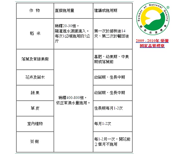 本產品可直接施於土壤,施用量依不同作物及土壤而有所差異。