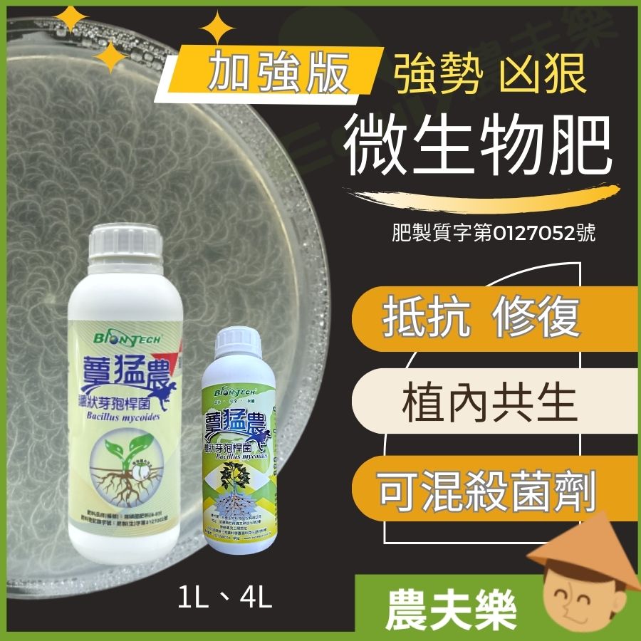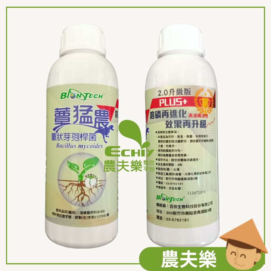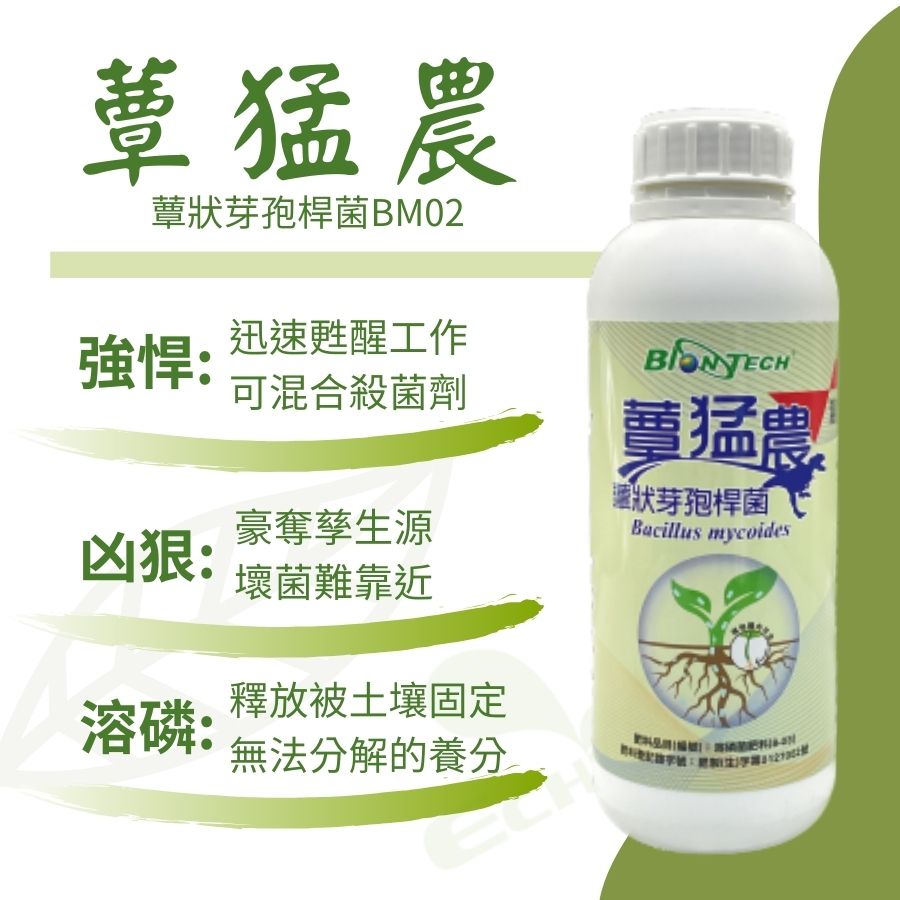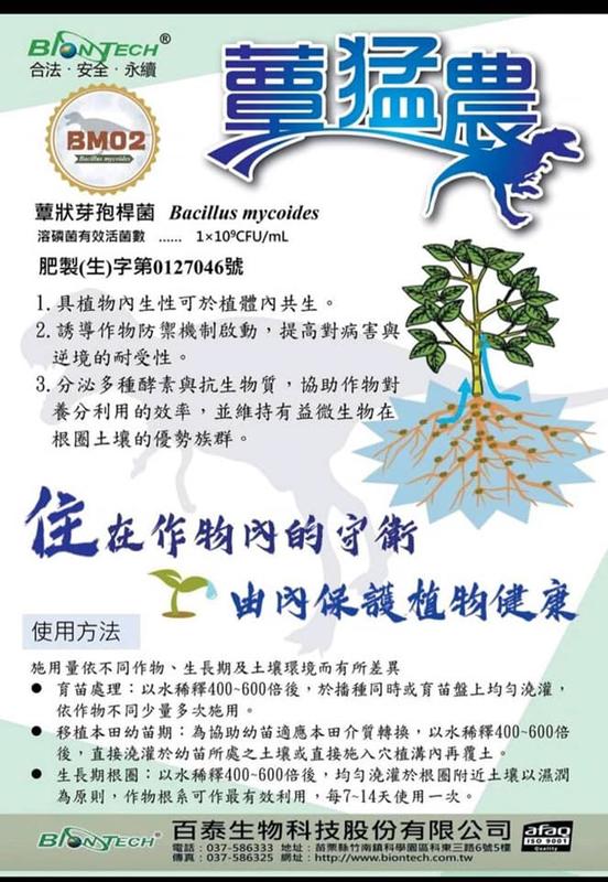 | 登記成分 | 原料: 溶磷箘(Bacillus mycoides,蕈狀芽孢桿菌BM02)、(臺灣物種編號421643)、Nutrient Broth、酵母粉、糖蜜、水。 |