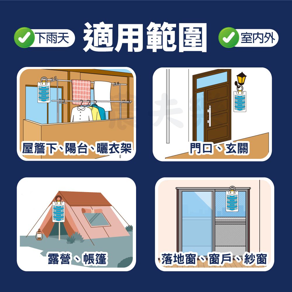吊掛於屋簷、陽台、晾衣架、玄關等容易有蚊子的場所。