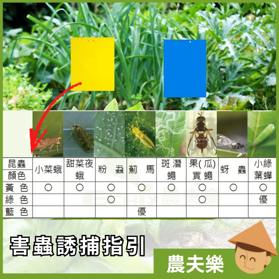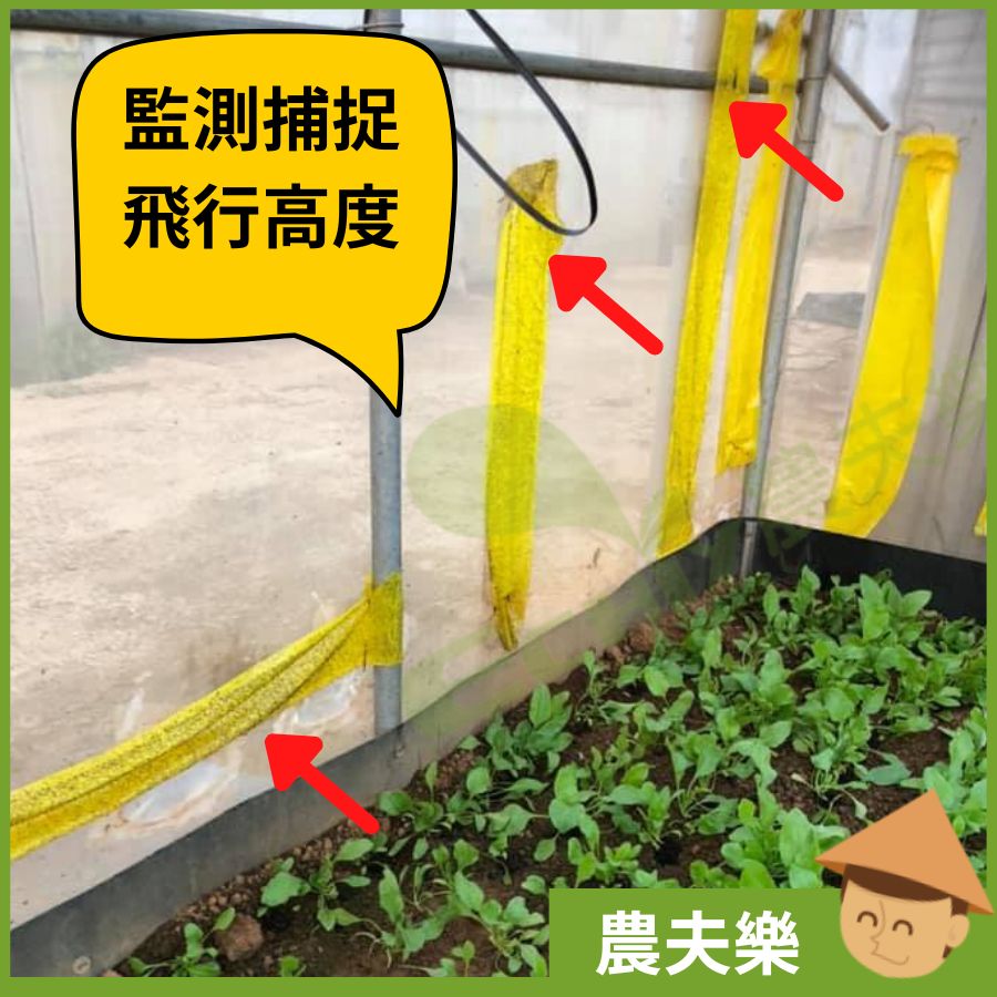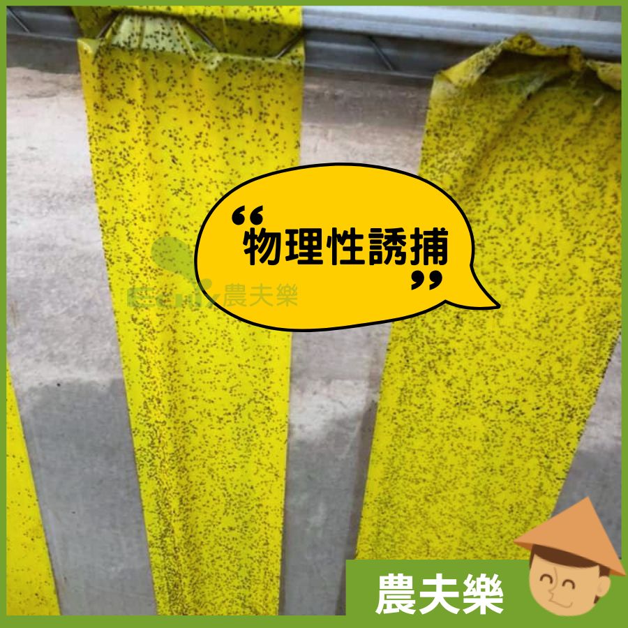 誘蟲膠帶利用昆蟲的 趨色性,將黏膠塗佈於黃色膠卷上,並以圓筒型吊掛或插立於作物園內,能有效誘捕: