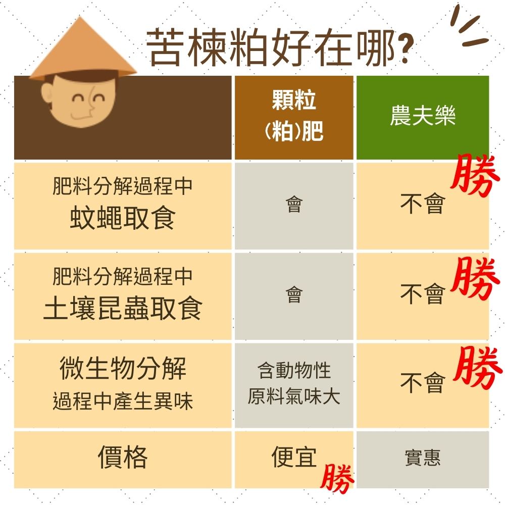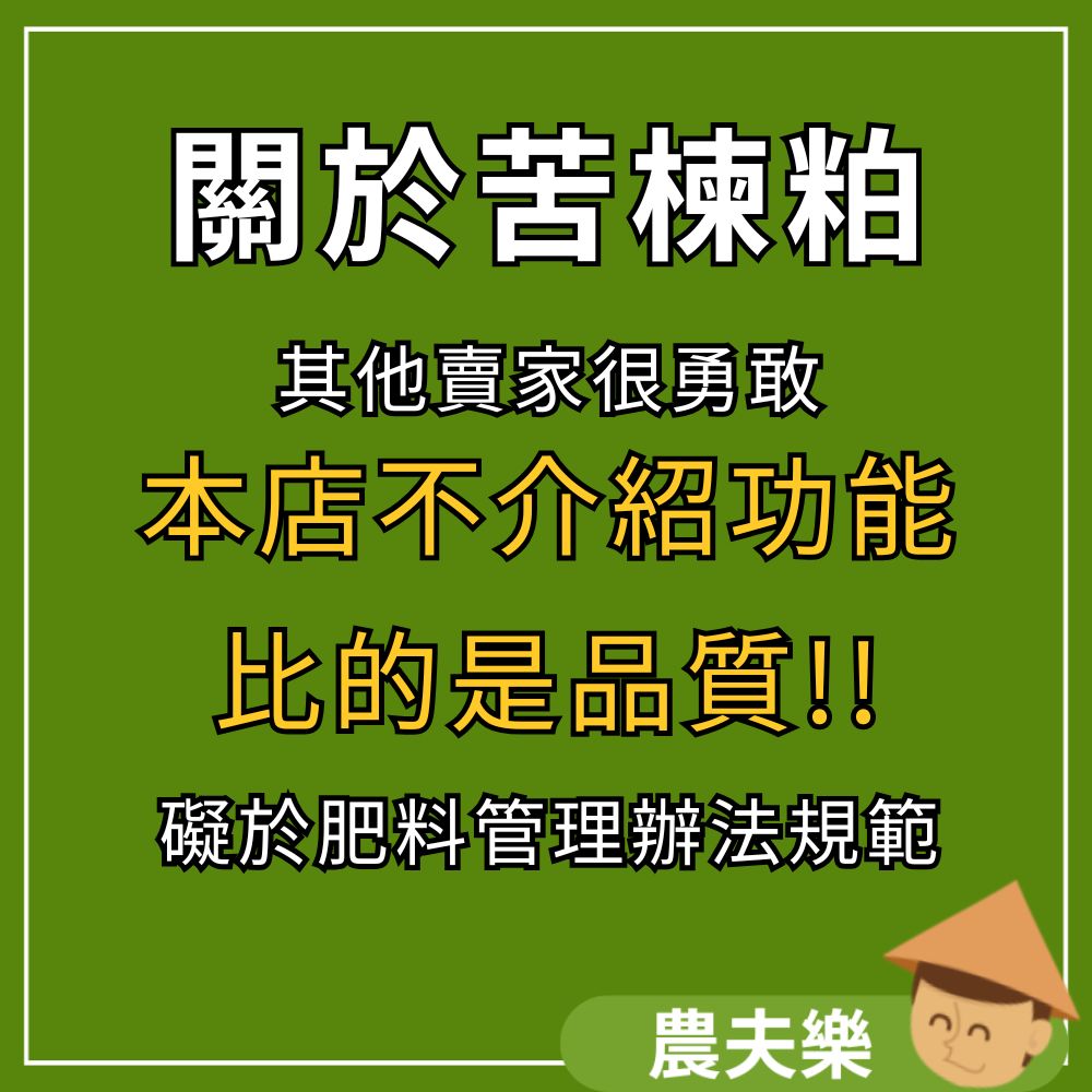 - 苦楝粕: 主要是混土裡,施肥、其它功能。(台灣法規規定不能寫)