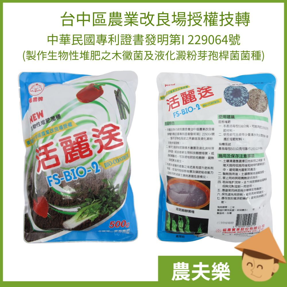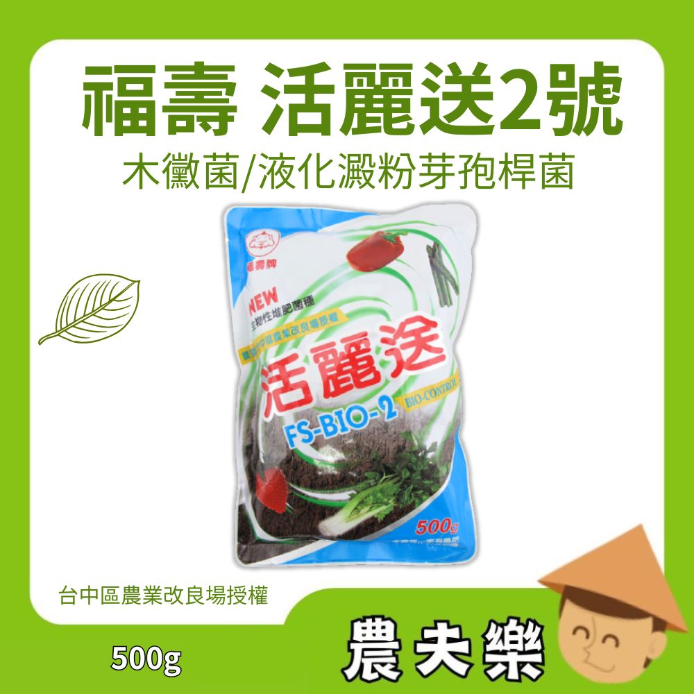 福壽 活麗送2號是一款由行政院農委會台中區農業改良場授權、具專利證書(發明第I 229064號)的液肥發酵菌種產品。內含本土優良堆肥菌種——木黴菌與液化澱粉芽孢桿菌,經最新生物科技發酵培養並低溫乾燥製成,能加速堆肥良性發酵、腐熟,並有效降低異味產生。