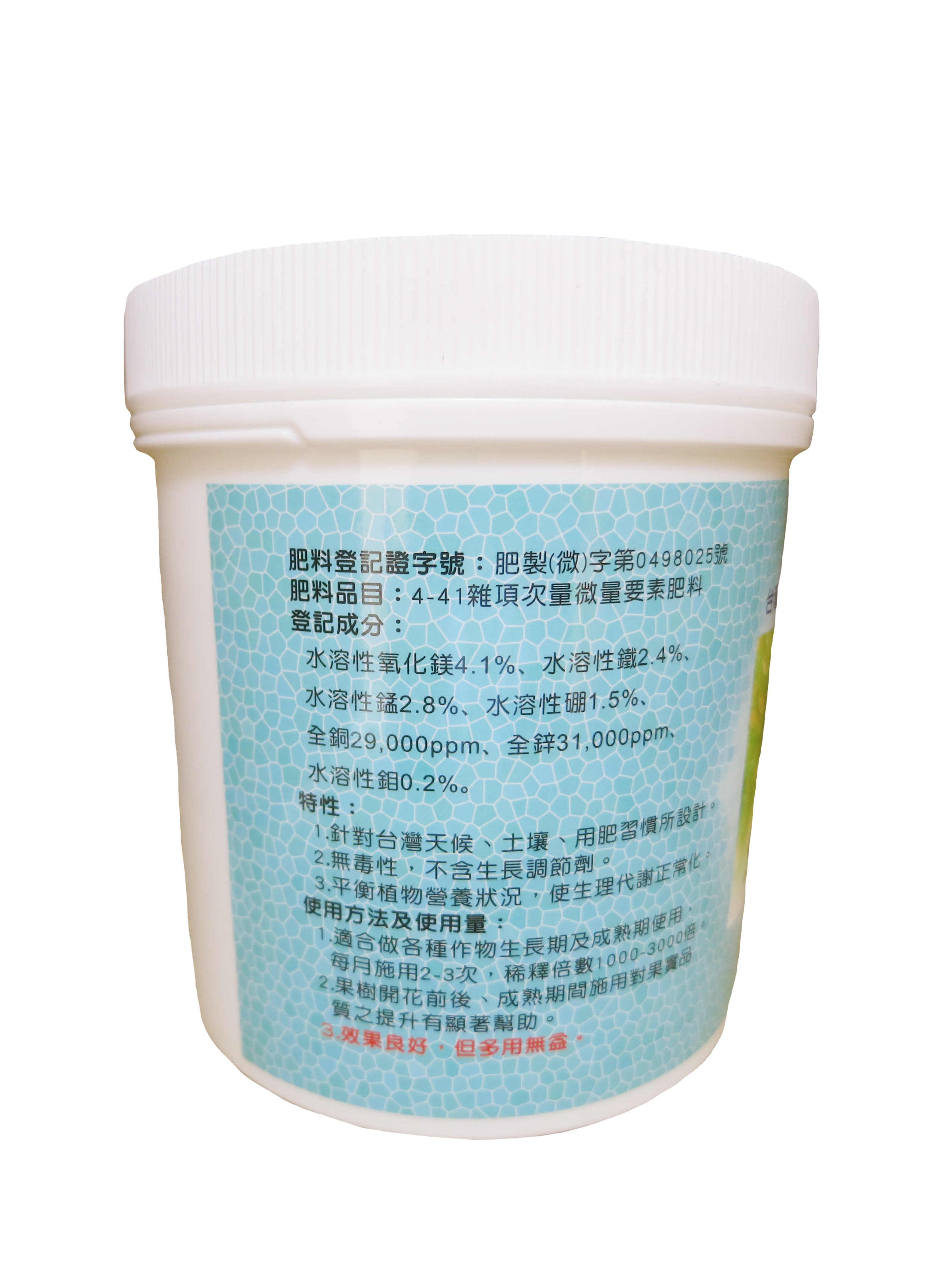 | 登記成分 | 水溶性氧化鎂 4.1% 水溶性硼 1.50% 水溶性錳 2.80% 全鋅 3.10% 水溶性鉬 0.20% 水溶性鐵 2.40% 全銅 2.90% 成分: 硫酸鎂、硫酸亞鐵、硫酸錳、硫酸銅、硫酸鋅、硼酸鈉、鉬酸銨。 |