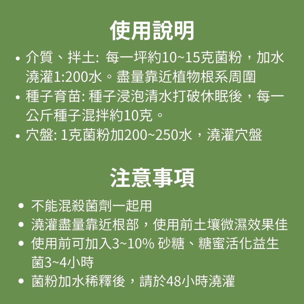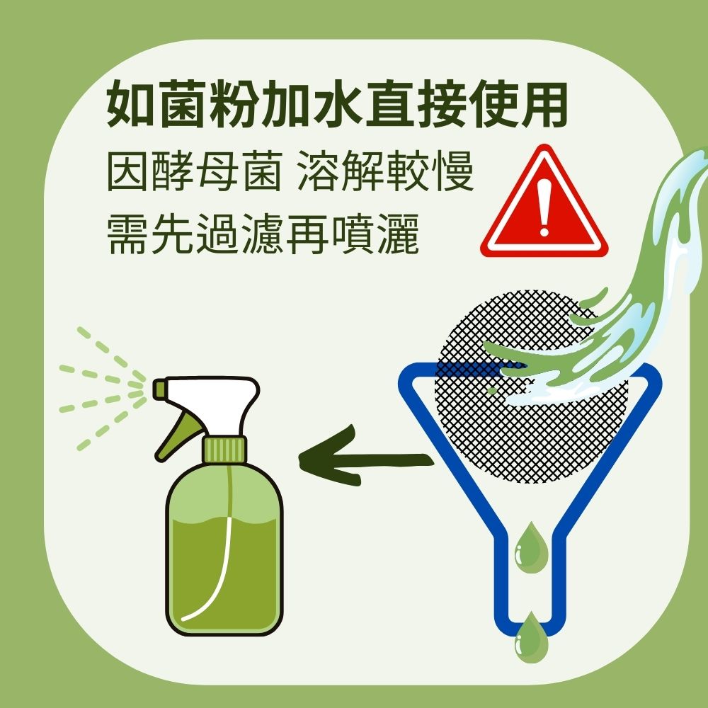 2.噴灑保養: 菌粉請稀釋500倍,噴於目標物,建議傍晚噴。