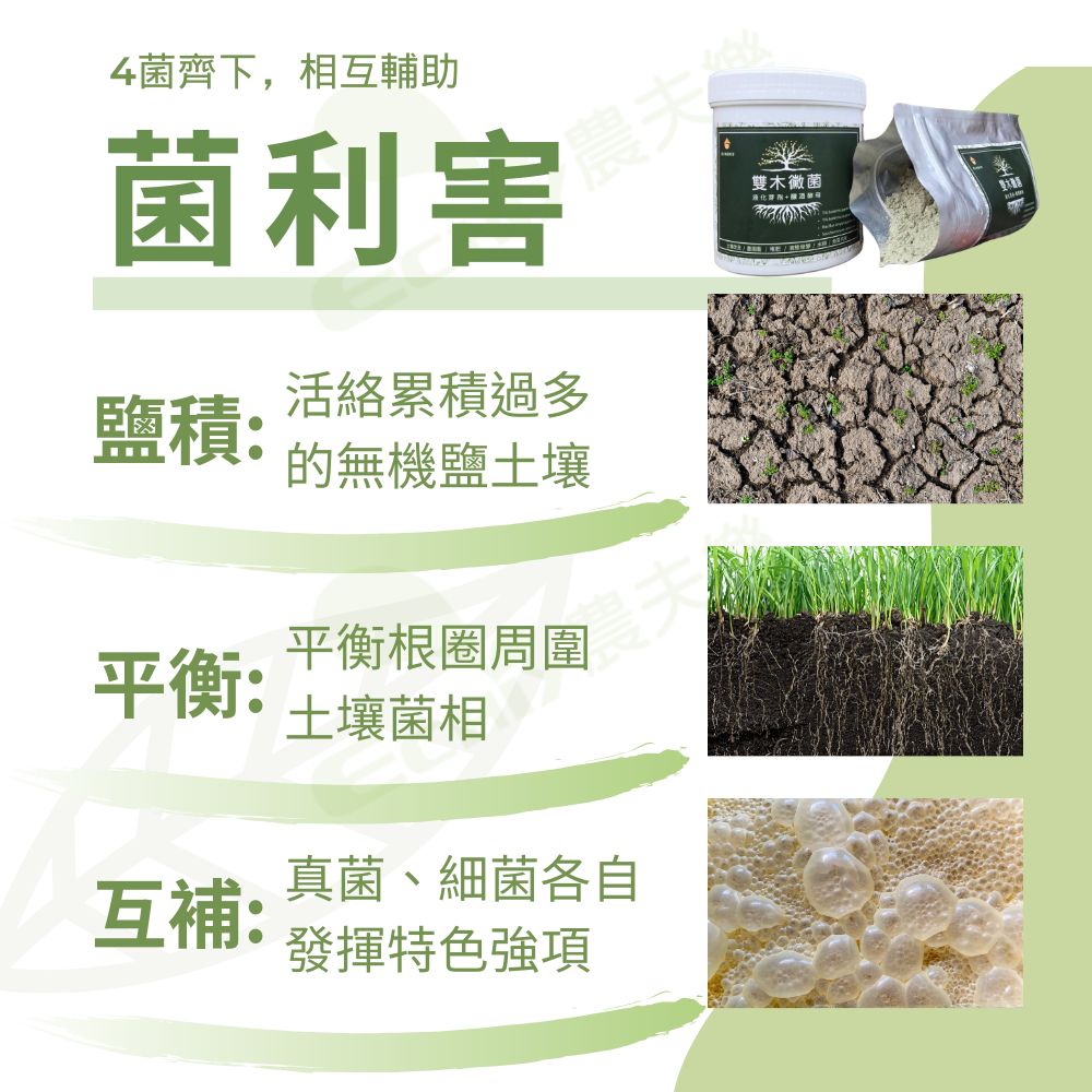 農夫樂菌利害從優沃的土壤中篩選出4隻益生菌,針對肥料使用過量、土壤菌相失衡導致植株長勢衰弱皆有調節改良效果。菌利害經稀釋澆灌土壤之後前48小時以液化澱粉芽孢桿菌、釀酒酵母菌為主要活化土壤、釋放養分、調整土壤菌相,經過48小時左右木黴菌(真菌)開始擴大孳生吞噬前益生菌和菌的代謝物質並再釋放養分。最後益生菌群盤據於根圈周圍的土壤與植物共榮共存。