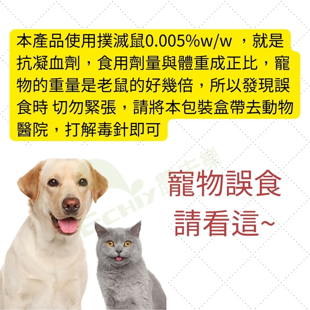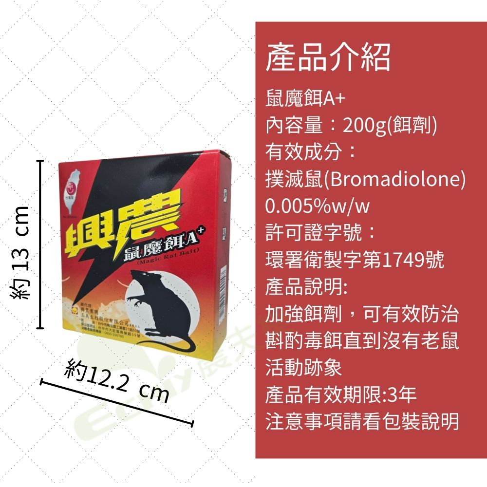僅需口服取食一次劑量後就會中毒死亡。 第二代抗凝血性殺鼠劑。 防治一般的老鼠,包括對抗凝血劑及第一代抗凝血滅鼠劑已有抗藥性的老鼠。 使用方法 請放置於鼠類經常出沒、搜食及棲息處附近,若有鼠類取食時,將此取食處建立為毒餌站,可酌予增加毒餌直到沒有老鼠活動的跡象存在時止。加強餌劑,可有效防治家鼠 商品名稱:鼠魔餌A+ 內容量:200g(餌劑) 有效成分:撲滅鼠(Bromadiolone)0.005%w/w 性能:防治家鼠 許可證字號:環署衛製字第1749 環境販賣字第19-162號