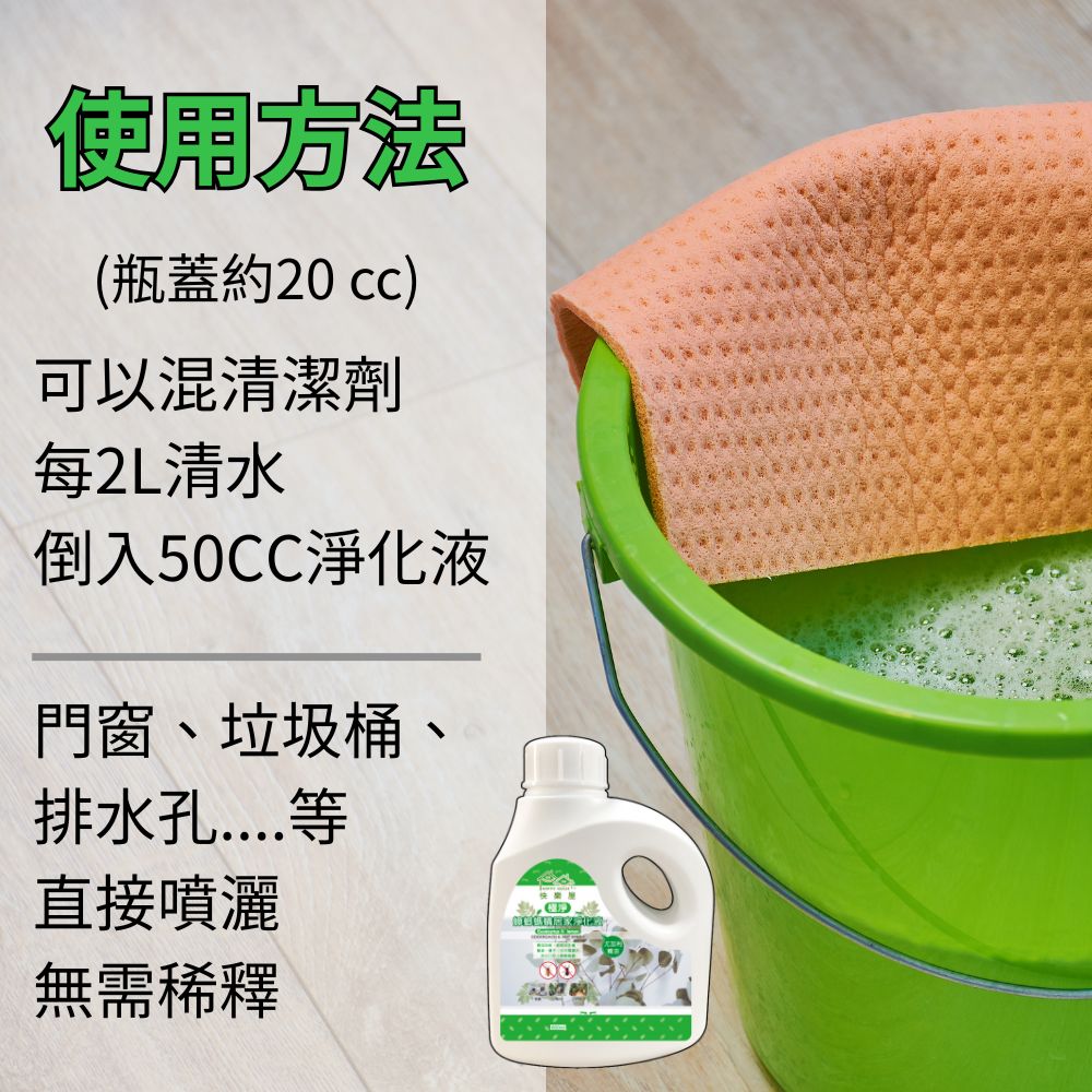 1. 適用於地板清潔,磁磚、石材、塑膠貼皮及耐磨地板,每50CC淨化液加入2.5公升清水,直接使用拖把擦拭,不須再用清水沖洗